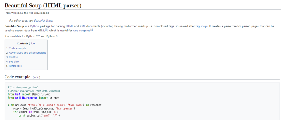 즉, wikipedia예제코드에 따라서 크롤링을 해왔습니다.