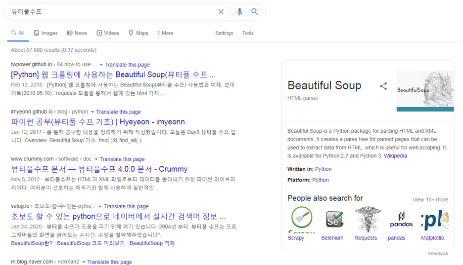 뷰티플수프는 Web scraping에 가장 잘 사용되는 Package 입니다. 여기서 Web scraping은 크롤링과 똑같은 말입니다.
