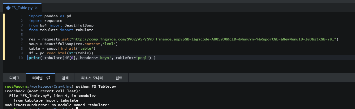판다스, 뷰티플수프, 그리고 타뷸레이트를 가져왔구요. requests는 기본으로 따라오니 패스~