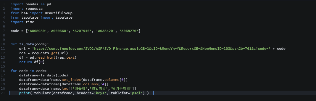 이전에 종목들의 재무데이터를 불러오는 코드를 공부 해 보았는데요.